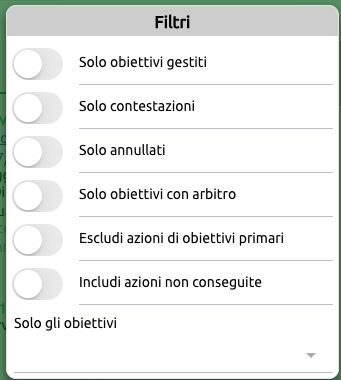 Seleziona la squadra: selezione della squadra a cui attribuire il risultato, autoselezionata se unica squadra disponibile. Se l'obiettivo può essere acquisito un'unica volta per ogni team, la lista proporrà solo le squadre che ancora non hanno conseguito un risultato sul'obiettivo.